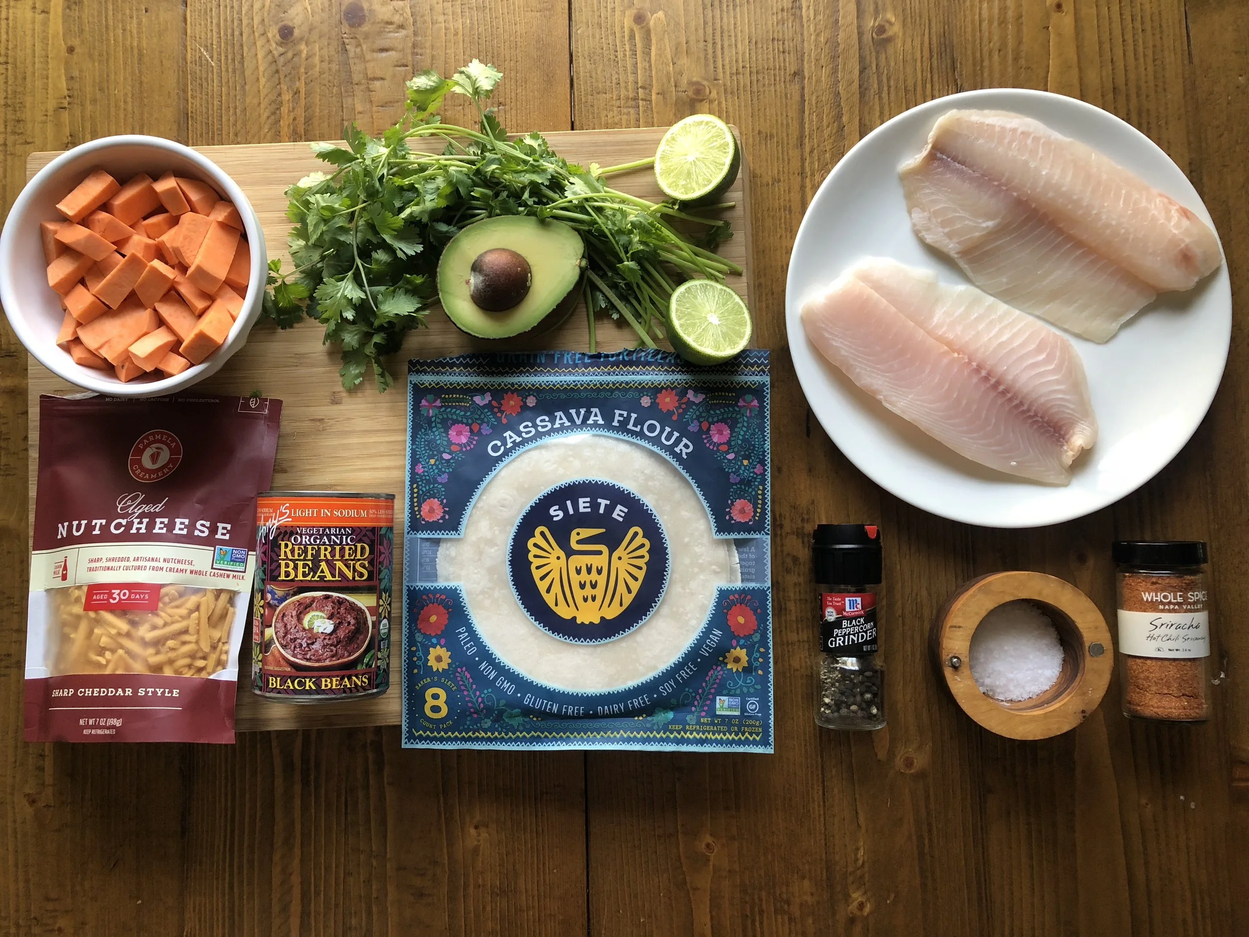 Finish by layering the black beans, sweet potatoes, tilapia, avocado, cilantro, squeeze lime over the top and enjoy!